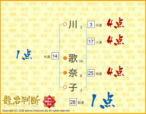 川(3画) 歌(14画)奈(8画)子(3画)