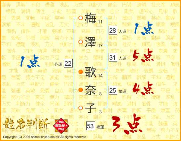 梅(11画)澤(17画) 歌(14画)奈(8画)子(3画)