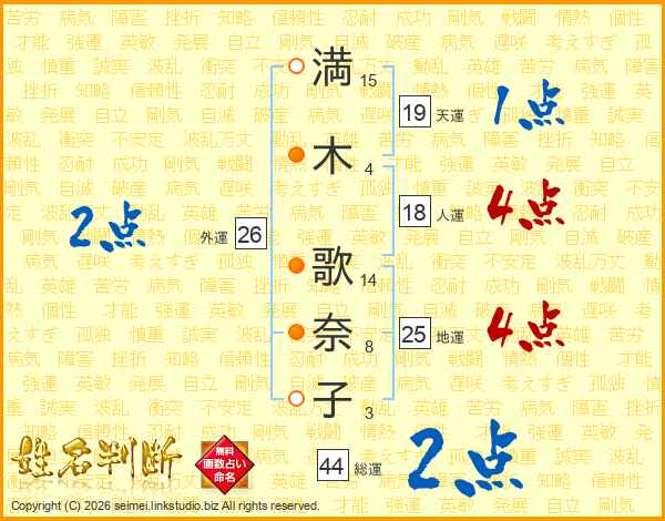 満(15画)木(4画) 歌(14画)奈(8画)子(3画)