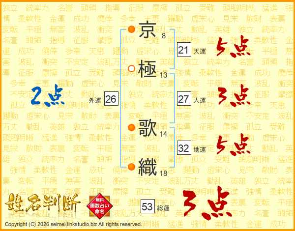 あなたの人生を表す1番重要な運勢です。生涯を通じて影響する総合運となり、主に50歳以降の晩年期に影響を及ぼします。苗字と名前の合計画数。