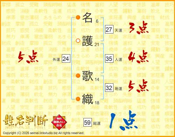 名(6画)護(21画) 歌(14画)織(18画)