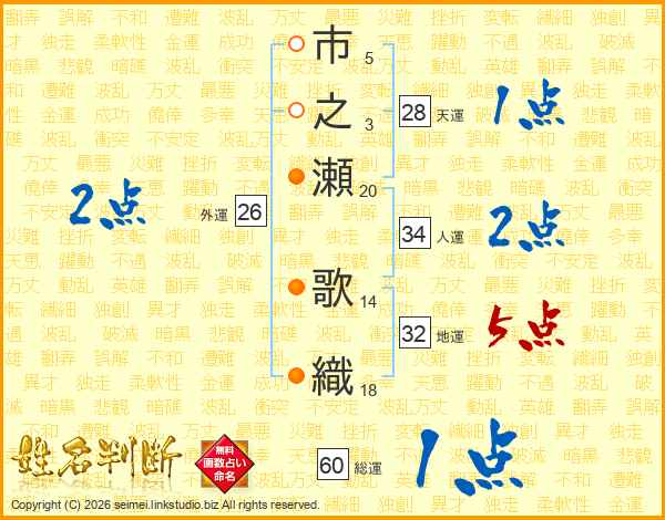 市(5画)之(3画)瀬(20画) 歌(14画)織(18画)
