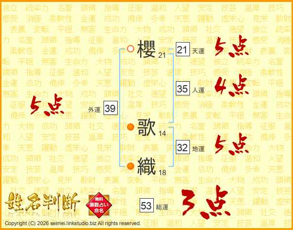 櫻歌織さんの外運は39画の5点!