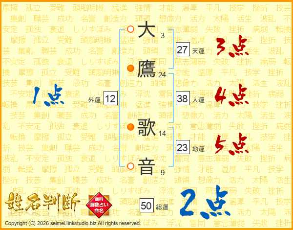 大(3画)鷹(24画) 歌(14画)音(9画)