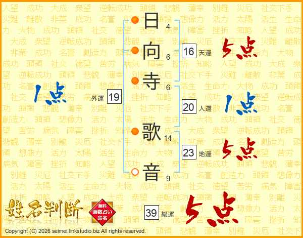 日(4画)向(6画)寺(6画) 歌(14画)音(9画)