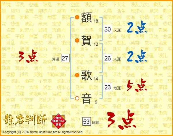 額(18画)賀(12画) 歌(14画)音(9画)
