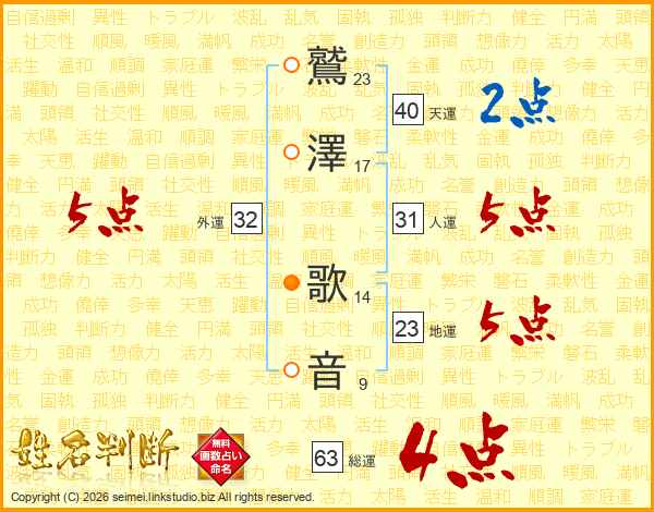 鷲(23画)澤(17画) 歌(14画)音(9画)