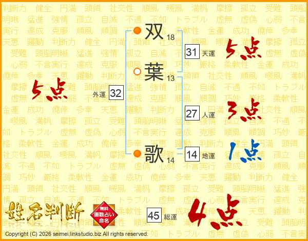 生活面を象徴する運勢です。外部から受ける影響力を表し、結婚運、家庭運や職場、環境への順応性を表します。総運から人運を引いた画数。姓や名が1文字の場合を除く。
