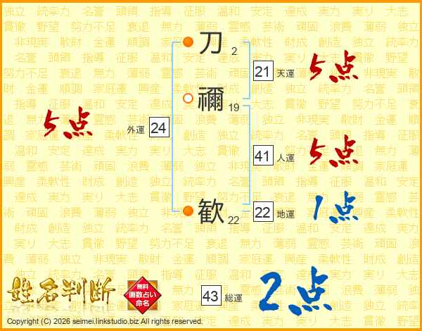 刀禰歓さんの総運は43画の2点!