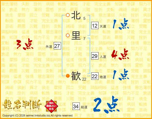 北里歓さんの地運は22画の1点!