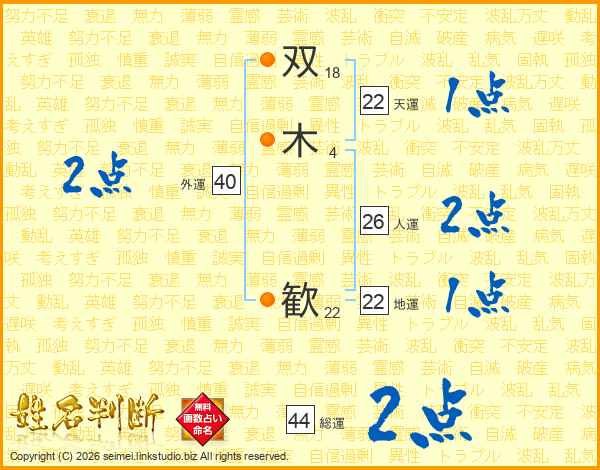 生活面を象徴する運勢です。外部から受ける影響力を表し、結婚運、家庭運や職場、環境への順応性を表します。総運から人運を引いた画数。姓や名が1文字の場合を除く。