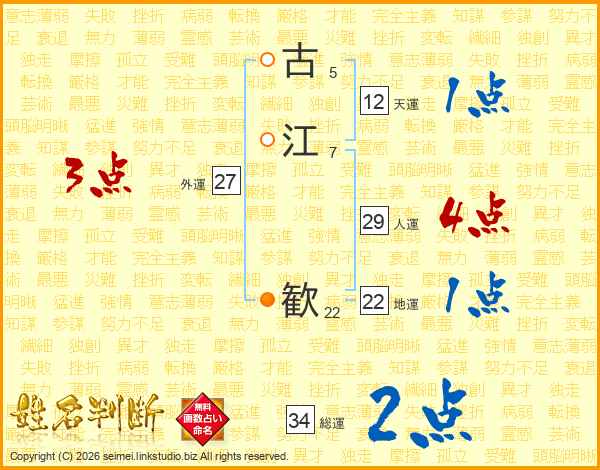 古(5画)江(7画) 歓(22画)