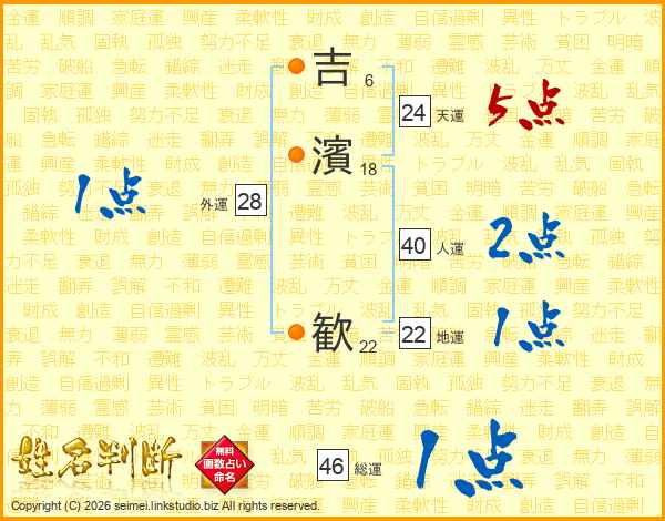 生活面を象徴する運勢です。外部から受ける影響力を表し、結婚運、家庭運や職場、環境への順応性を表します。総運から人運を引いた画数。姓や名が1文字の場合を除く。