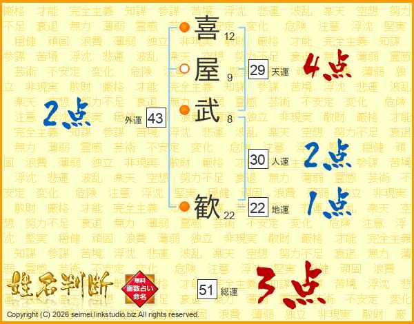 喜(12画)屋(9画)武(8画) 歓(22画)