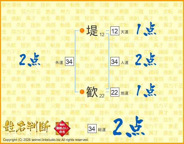 生活面を象徴する運勢です。外部から受ける影響力を表し、結婚運、家庭運や職場、環境への順応性を表します。総運から人運を引いた画数。姓や名が1文字の場合を除く。