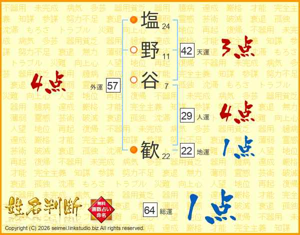 塩(24画)野(11画)谷(7画) 歓(22画)