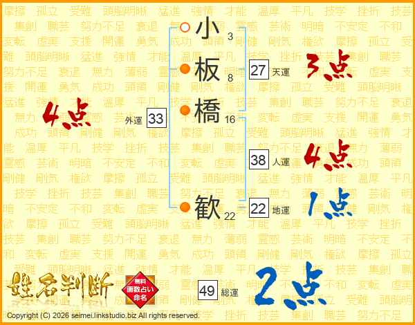 小板橋歓さんの人運は38画の4点!