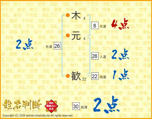 木元歓さんの人運は26画の2点!