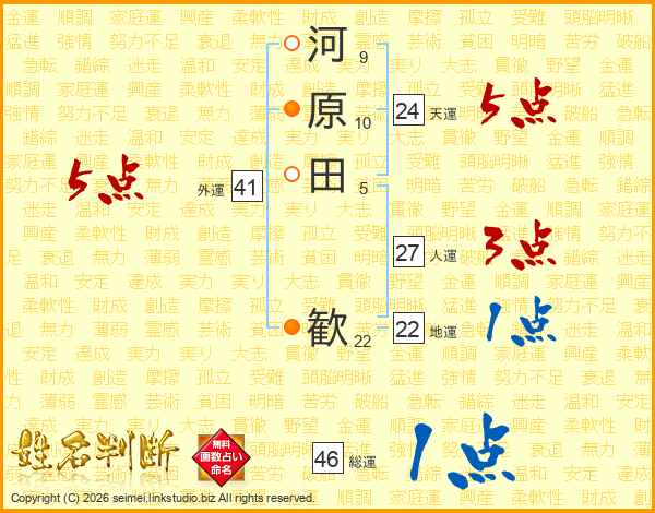 生活面を象徴する運勢です。外部から受ける影響力を表し、結婚運、家庭運や職場、環境への順応性を表します。総運から人運を引いた画数。姓や名が1文字の場合を除く。