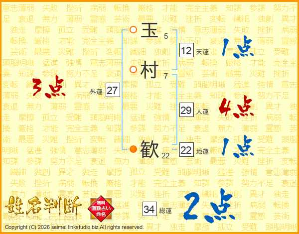 玉(5画)村(7画) 歓(22画)