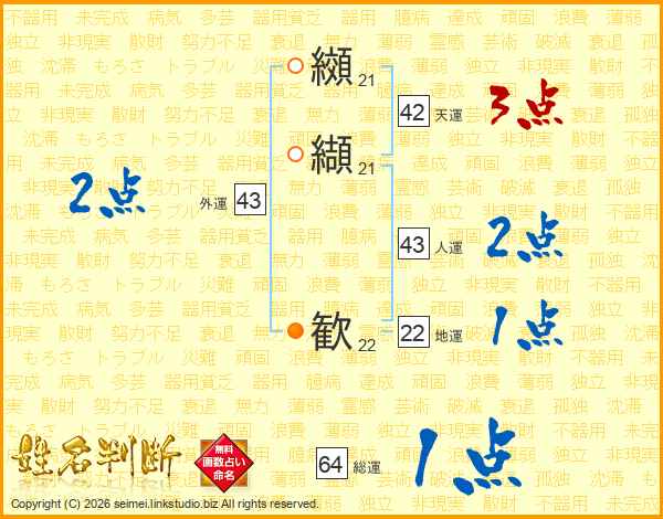纐纈歓さんの人運は43画の2点!