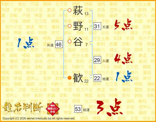 萩野谷歓さんの天運は31画の5点!