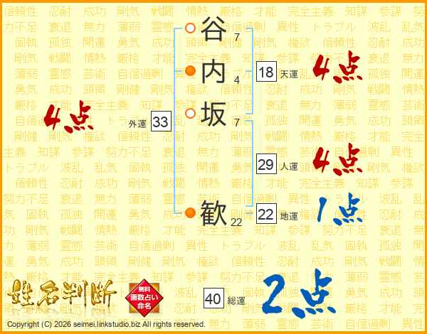 谷(7画)内(4画)坂(7画) 歓(22画)