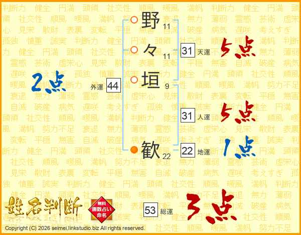 野々垣歓さんの人運は31画の5点!