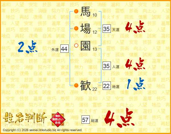 生活面を象徴する運勢です。外部から受ける影響力を表し、結婚運、家庭運や職場、環境への順応性を表します。総運から人運を引いた画数。姓や名が1文字の場合を除く。