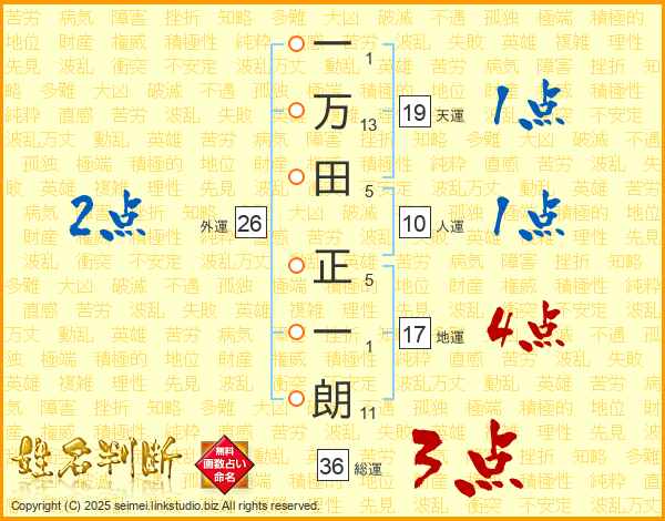 一(1画)万(13画)田(5画) 正(5画)一(1画)朗(11画)