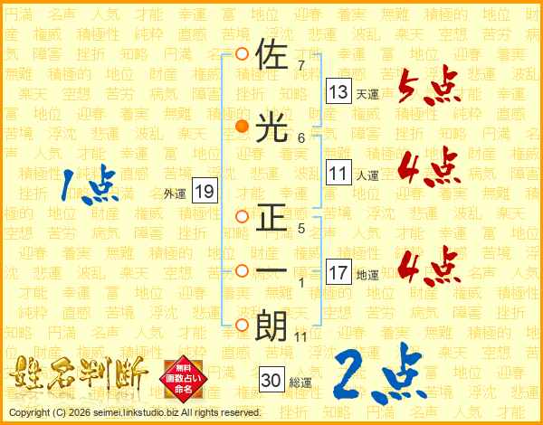 佐(7画)光(6画) 正(5画)一(1画)朗(11画)