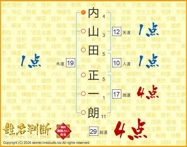 内(4画)山(3画)田(5画) 正(5画)一(1画)朗(11画)