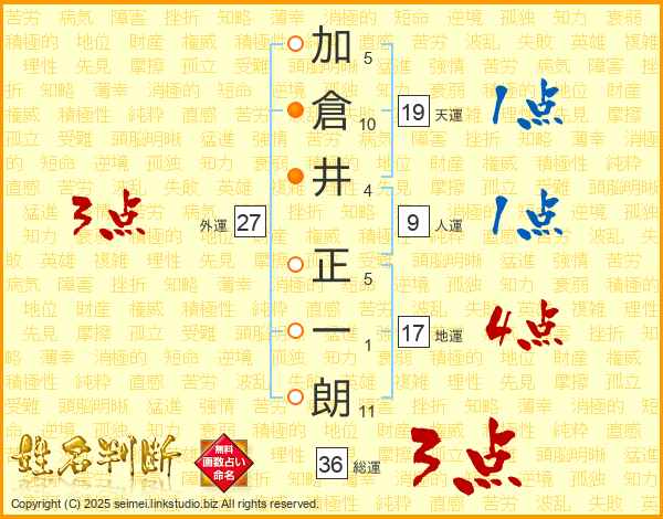 加(5画)倉(10画)井(4画) 正(5画)一(1画)朗(11画)