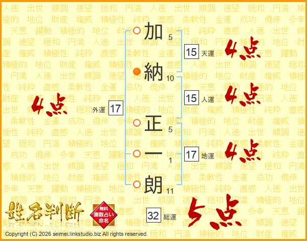加(5画)納(10画) 正(5画)一(1画)朗(11画)