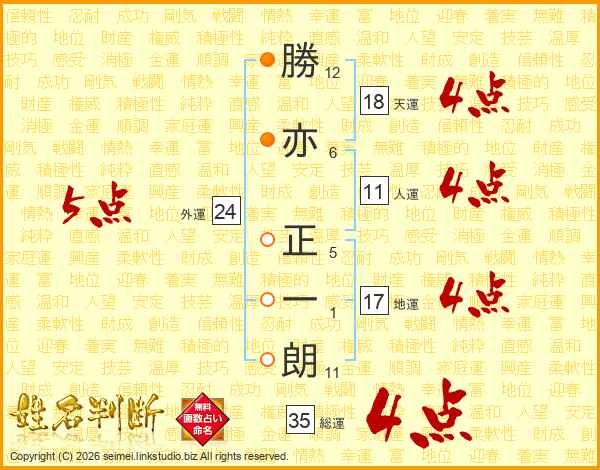 勝(12画)亦(6画) 正(5画)一(1画)朗(11画)