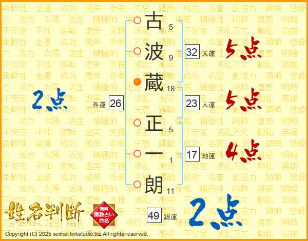 古(5画)波(9画)蔵(18画) 正(5画)一(1画)朗(11画)