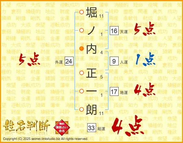 堀(11画)ノ(1画)内(4画) 正(5画)一(1画)朗(11画)