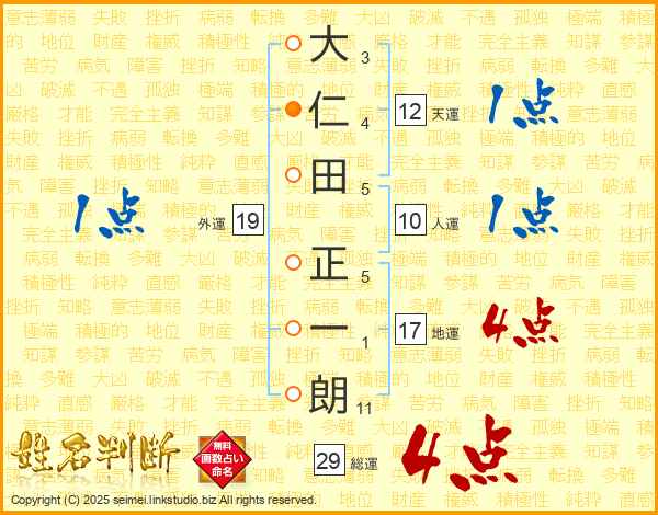 大(3画)仁(4画)田(5画) 正(5画)一(1画)朗(11画)