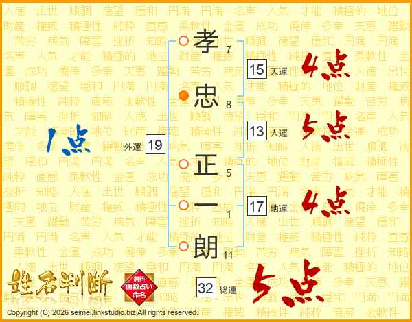 孝(7画)忠(8画) 正(5画)一(1画)朗(11画)