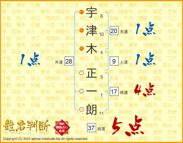 宇(6画)津(10画)木(4画) 正(5画)一(1画)朗(11画)