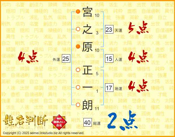 宮(10画)之(3画)原(10画) 正(5画)一(1画)朗(11画)