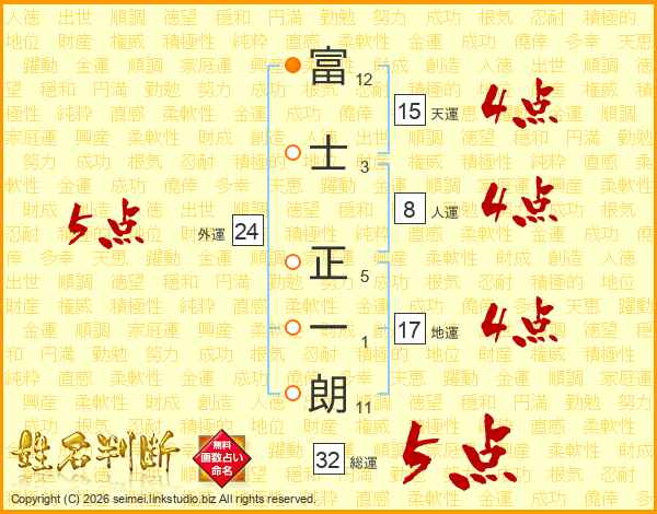 富(12画)士(3画) 正(5画)一(1画)朗(11画)
