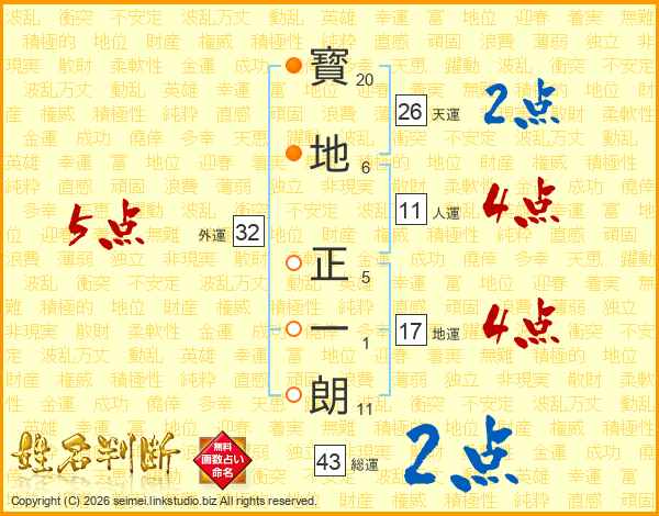 寳(20画)地(6画) 正(5画)一(1画)朗(11画)