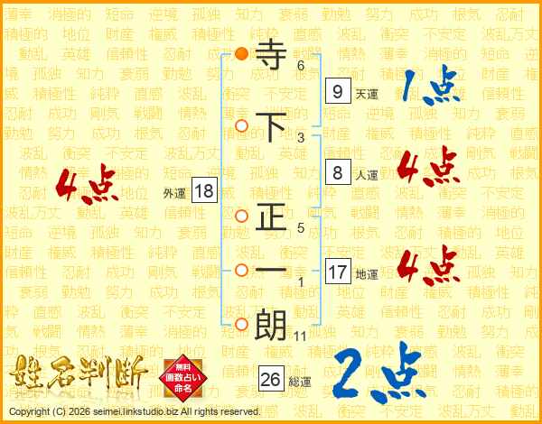 寺(6画)下(3画) 正(5画)一(1画)朗(11画)