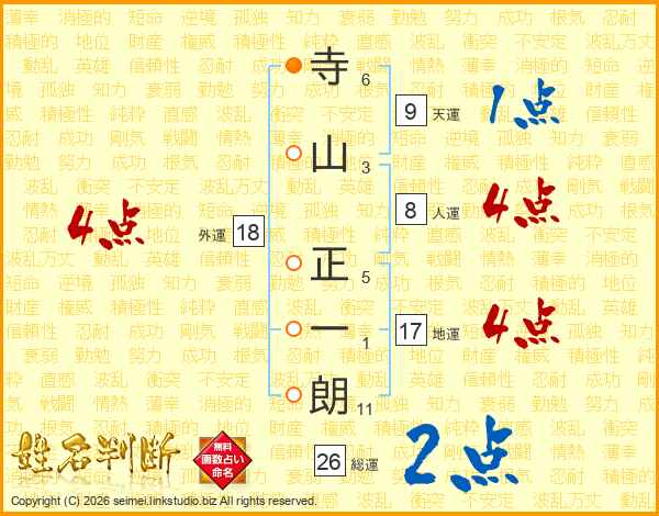 寺(6画)山(3画) 正(5画)一(1画)朗(11画)