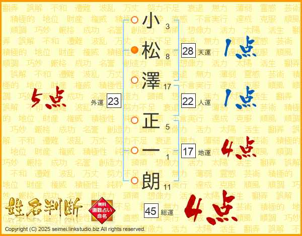 小(3画)松(8画)澤(17画) 正(5画)一(1画)朗(11画)