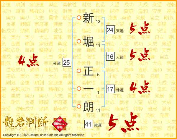 新(13画)堀(11画) 正(5画)一(1画)朗(11画)