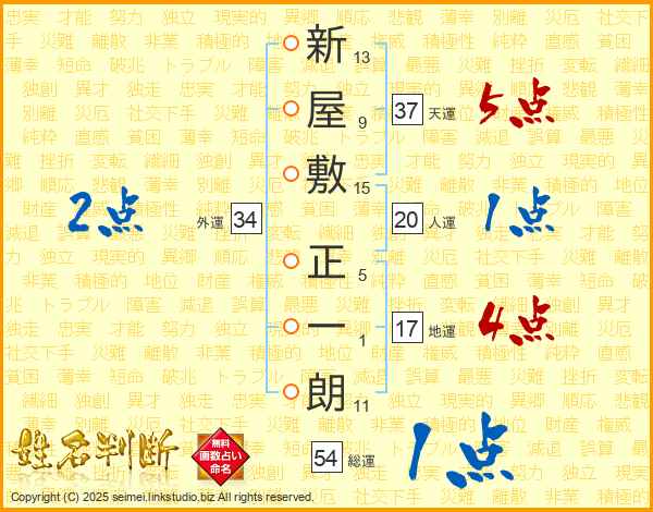 新(13画)屋(9画)敷(15画) 正(5画)一(1画)朗(11画)