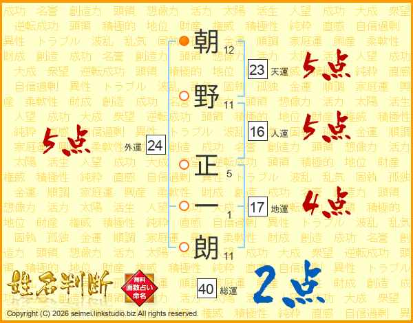 朝(12画)野(11画) 正(5画)一(1画)朗(11画)