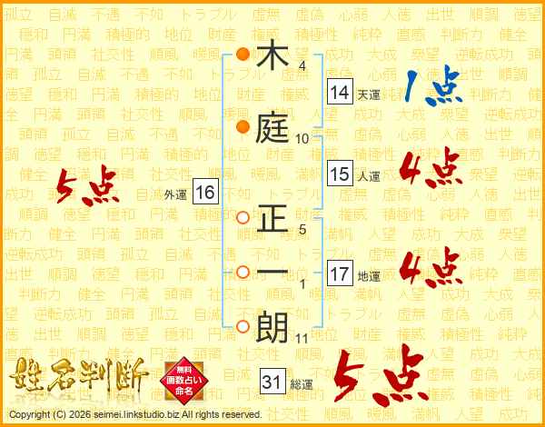 木(4画)庭(10画) 正(5画)一(1画)朗(11画)